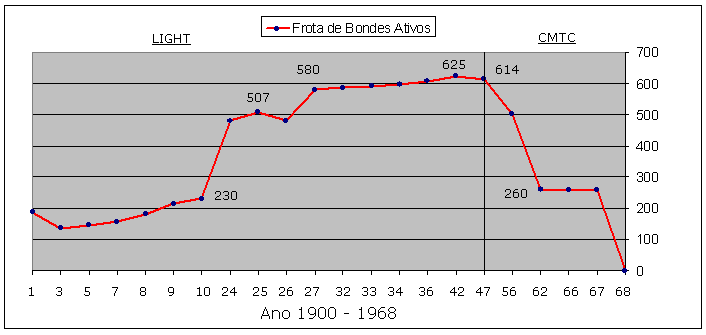 O quadro abaixo mostra a frota de bondes existentes entre 1900 e 1968, incluindo aí todos os tipos de carros de passageiros, de carga e de serviços.