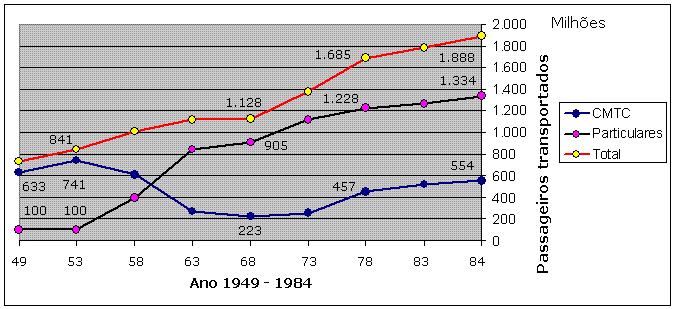 Verificamos que os papéis foram invertidos, pois, a princípio, a companhia municipal tinha a incumbência de ser a principal empresa de transporte da metrópole, mas, foi perdendo a sua liderança para as empresas particulares no período de uma década. Até 1968 estão incluídos os passageiros dos bondes.