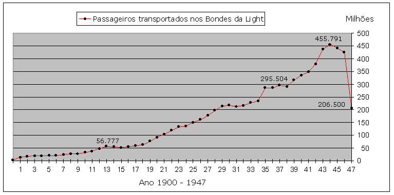 A transferência definitiva do Sistema de Bondes para a prefeitura só iria ocorrer em 1947.O quadro abaixo mostra a evolução do Sistema de Bondes de 1900 a 1947 com referência ao transporte de passageiros. Em 1947 a população da cidade era de 1.963.000 habitantes.