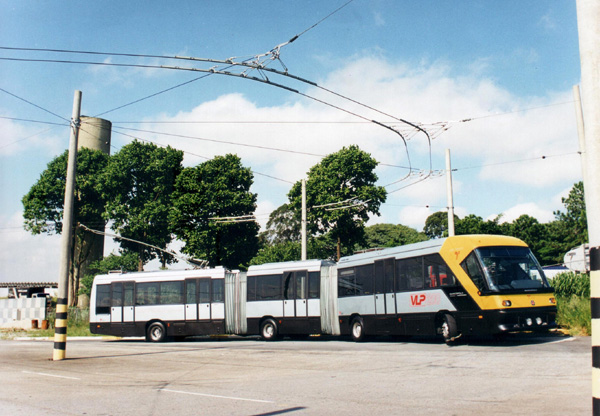 Trólebus bi-articulado dotado de guiagem por meio de um trilho central. A tração é transmitida através dos pneus de borracha, de tala larga.