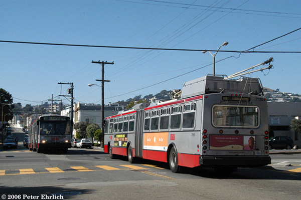 Trólebus bi-modal articulado, em São Francisco - Estados Unidos, operando no modo diesel (sem rede).Possibilita aos trólebus operarem desconectados da rede em emergências, desvios ou até em extensões de linhas desprovidas de rede.