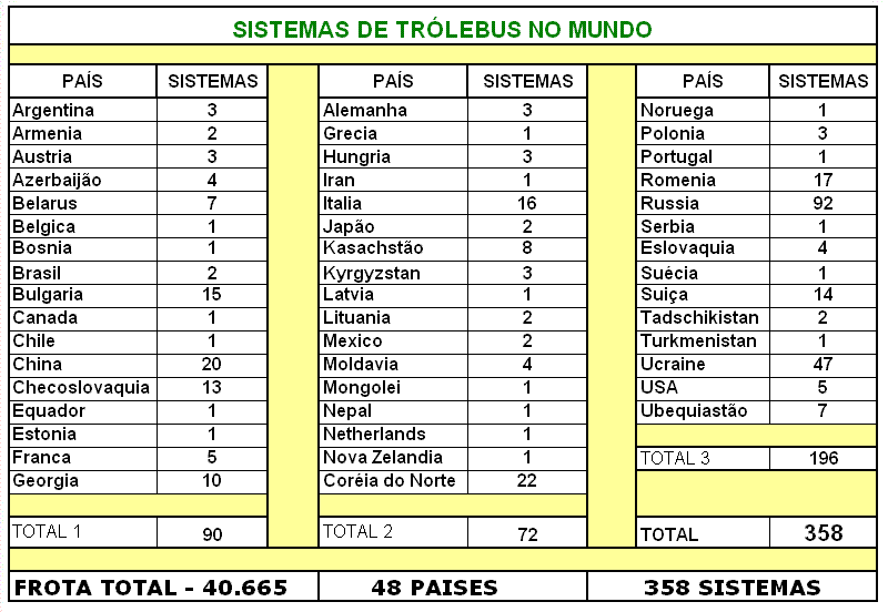 Existem cerca de 360 Sistemas de trólebus espalhados em 48 países, com uma frota total aproximada de 40.700 veículos.
